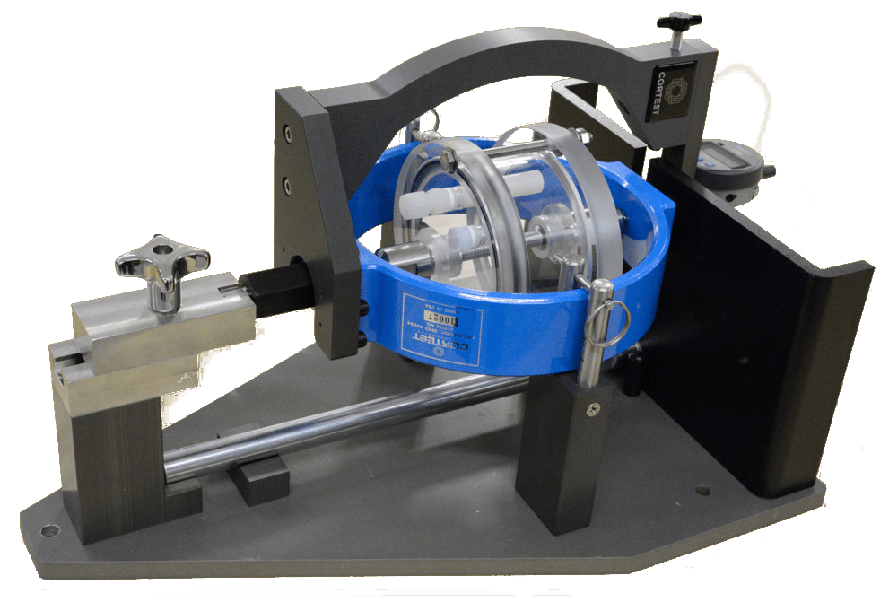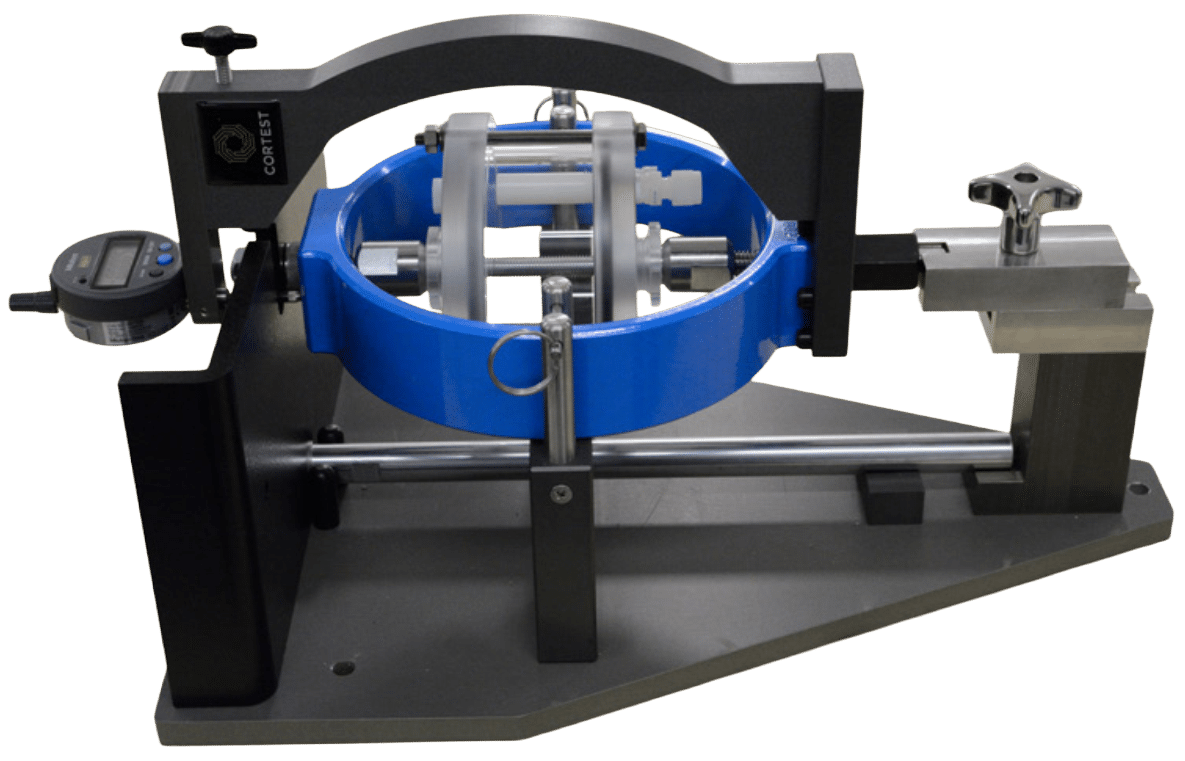 The proof ring loading fixture is designed to quickly and accurately load a Cortest proof ring assembly to any specified load. The fixture includes a base to secure the proof ring assembly when applying torque to its adjusting nut, and a tool to accurately measure the deflection of the proof ring. Rather than using a guess and check method, this device allows you to measure the deflection of the ring in real time which will greatly reduce the preparation time for your proof ring tests. This device provides accurate and consistent test setup when performing multiple proof ring tests.
