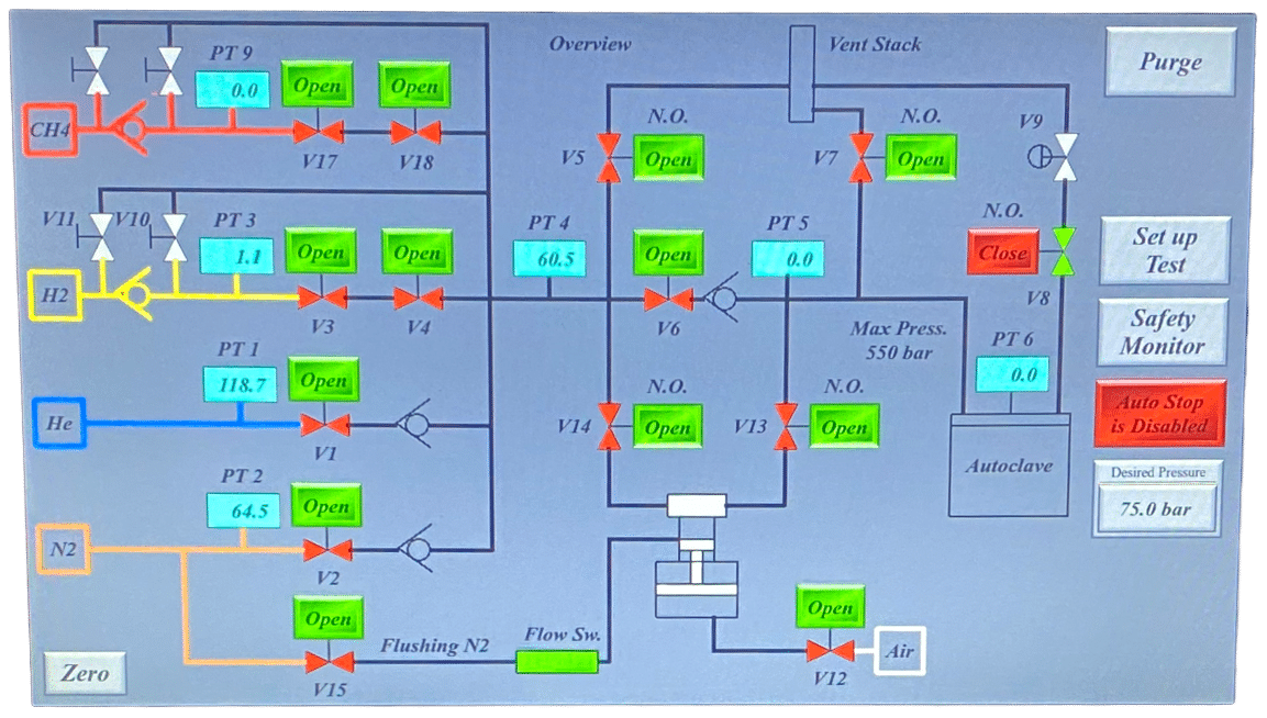 Cortest custom software is developed to monitor and control all aspects of the testing process. The software is integrated into both our custom touch screen controls and computer based controls. Load frame software allows for accurate control, display, and recording of the load on the specimen. System software integrates system gas and flame sensors, valve panel components, and fan sensors to allow full system control and response if an issue is detected. Software can be customized for project specific requirements.