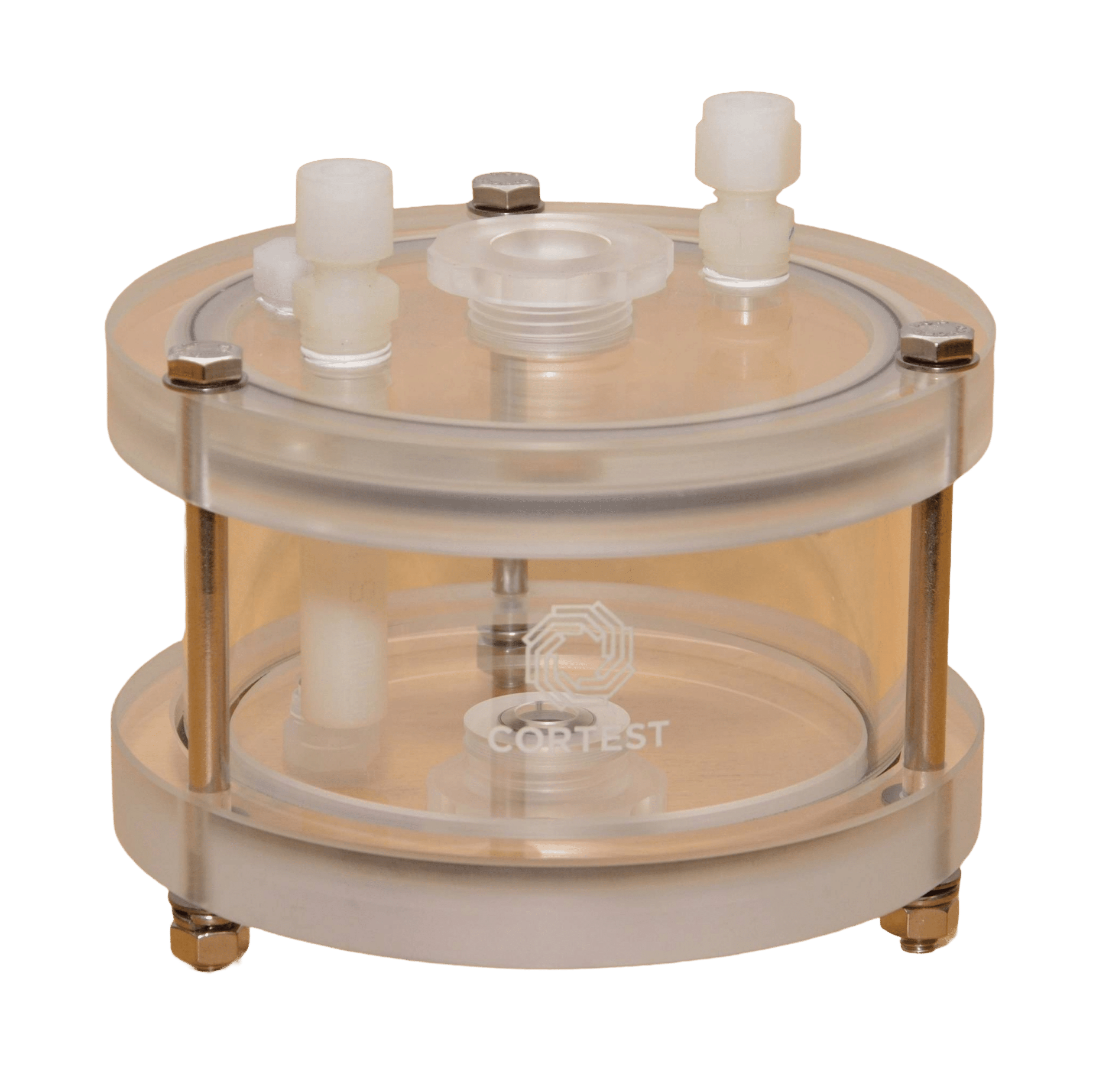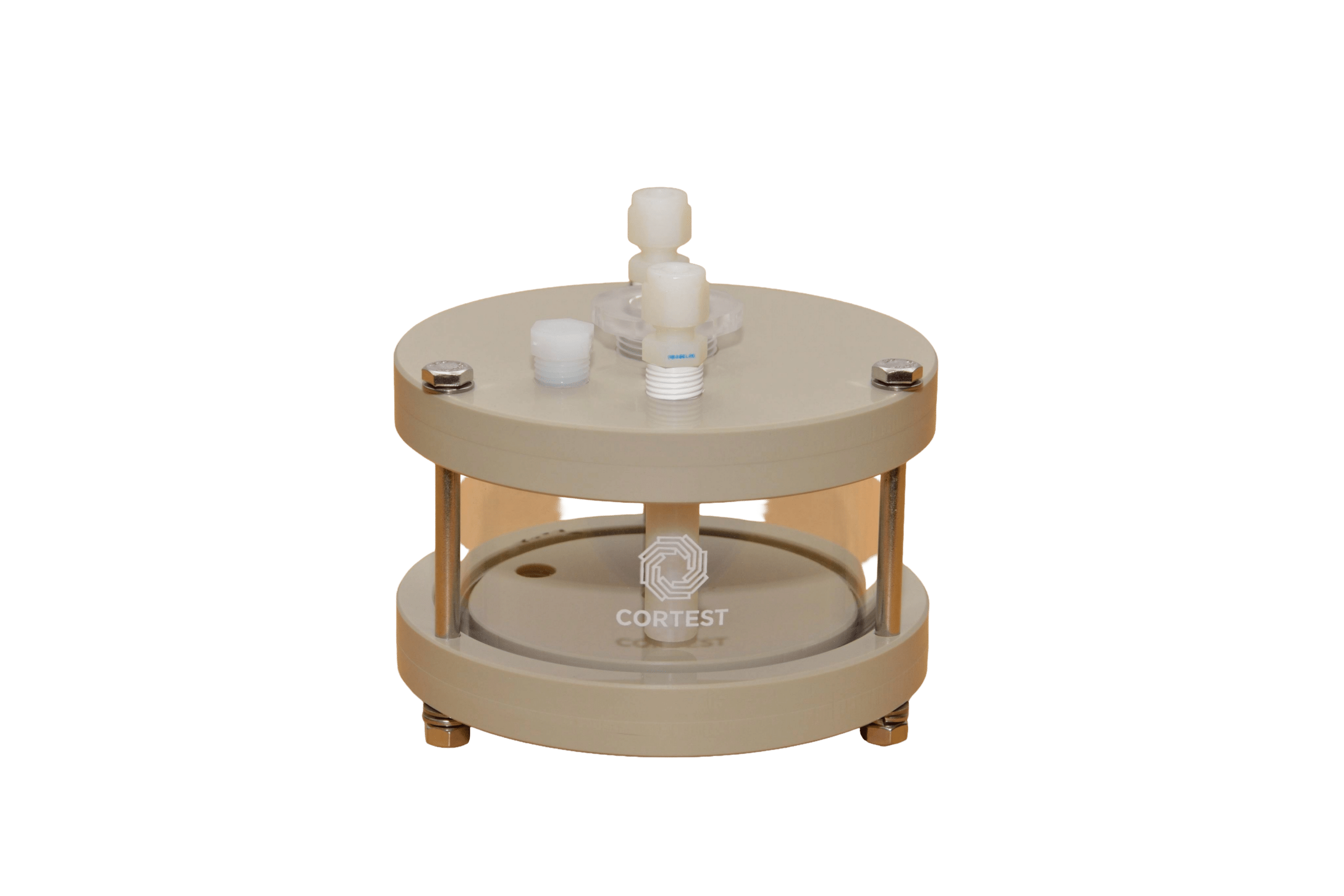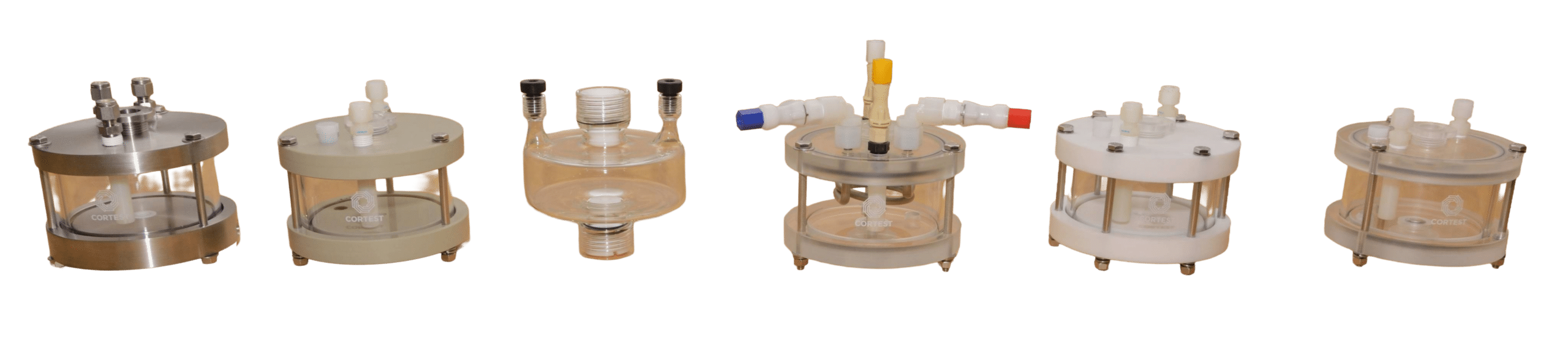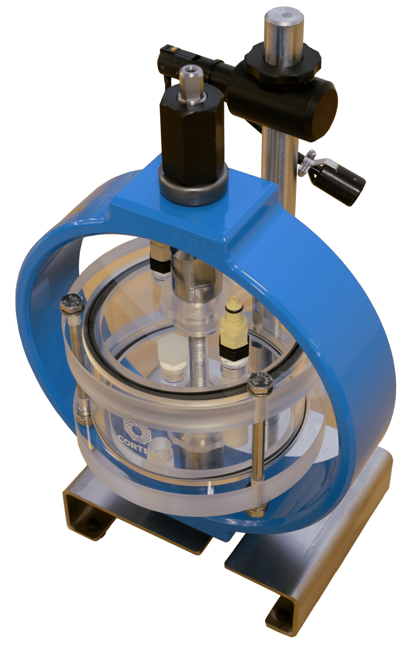 Cortest also offers Pyrex vessels as another ambient condition vessel. These vessels are custom blown from Pyrex glass. Despite the fragility of these vessels, their specimen seals are designed such that the impact of the specimen failure is not absorbed by the test cell. These vessels are made of Pyrex, making them ideal for aggressive environments that standard acrylic test cells may not be suitable for. Further, these test cells will not discolor from use during testing. These vessels can also be used in Cortest Load Frames or Deadweight Testers.