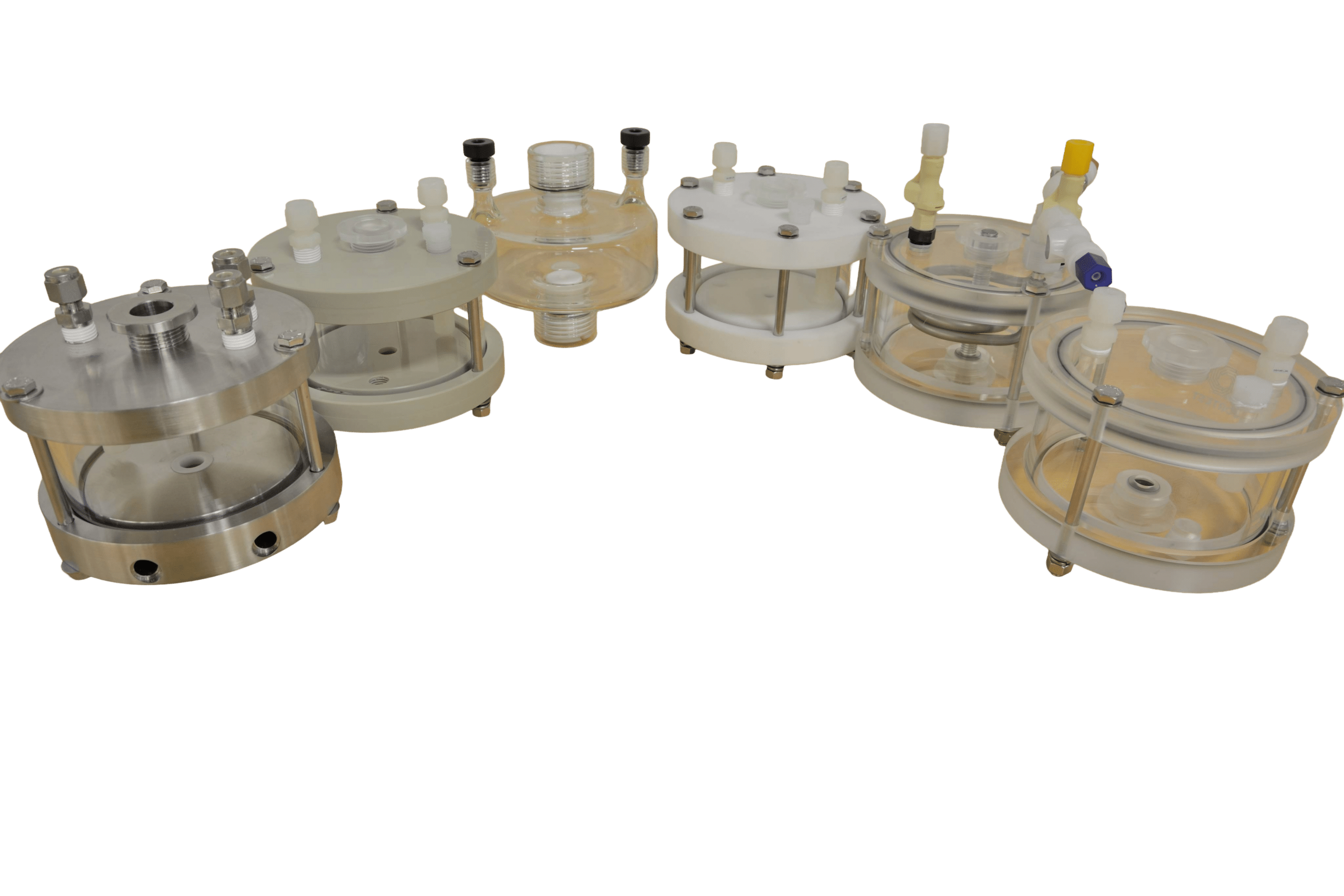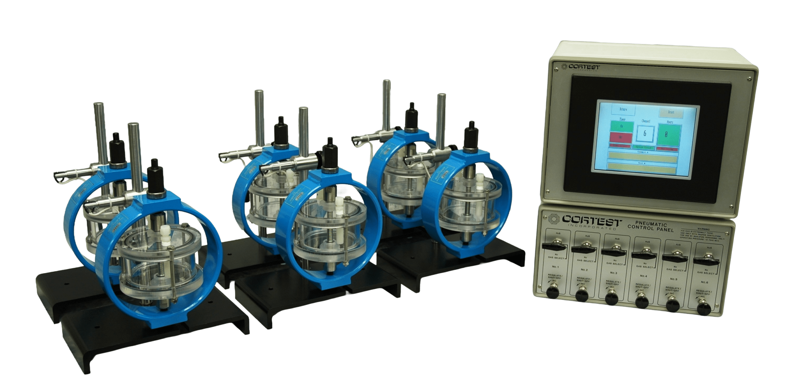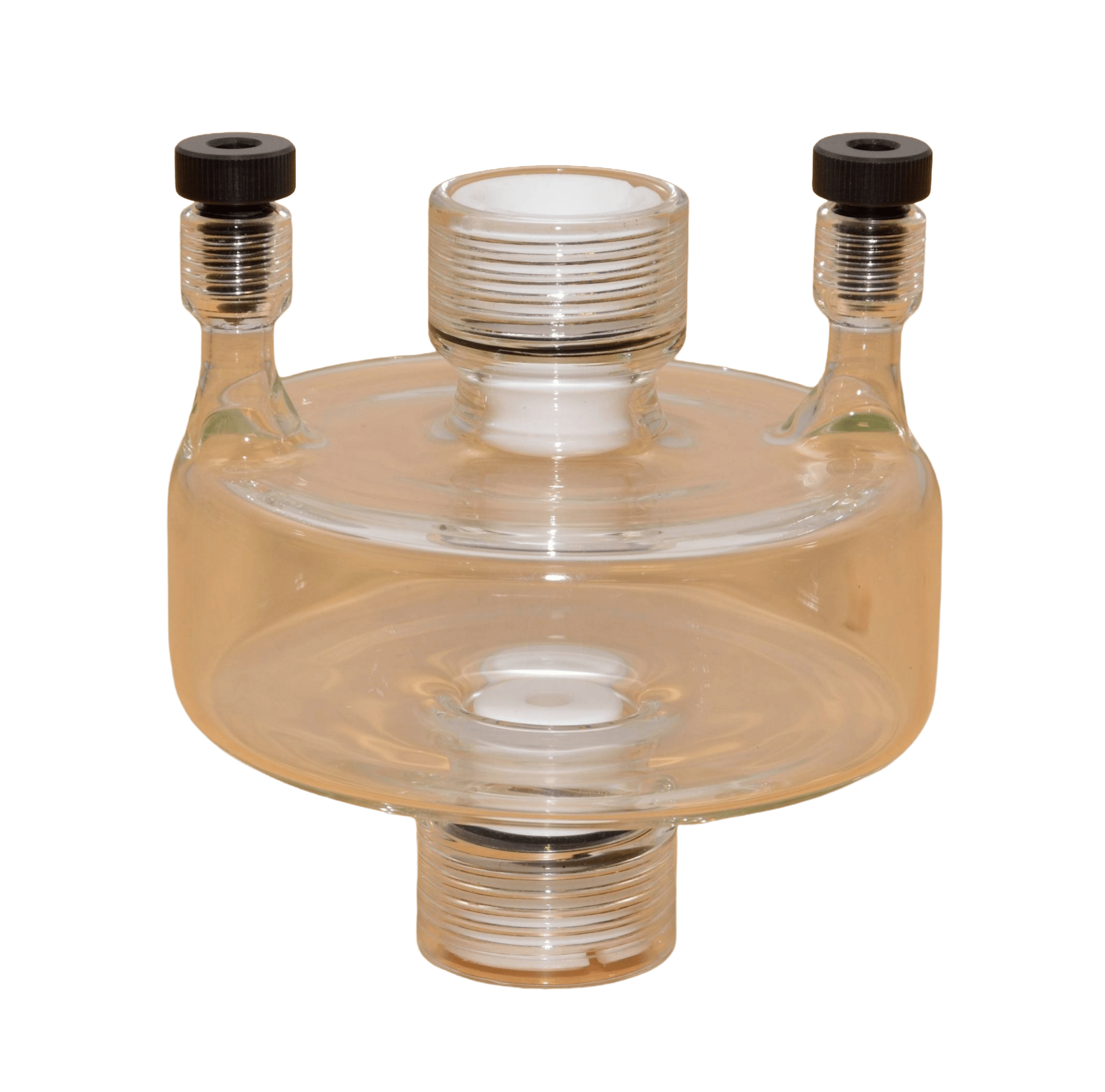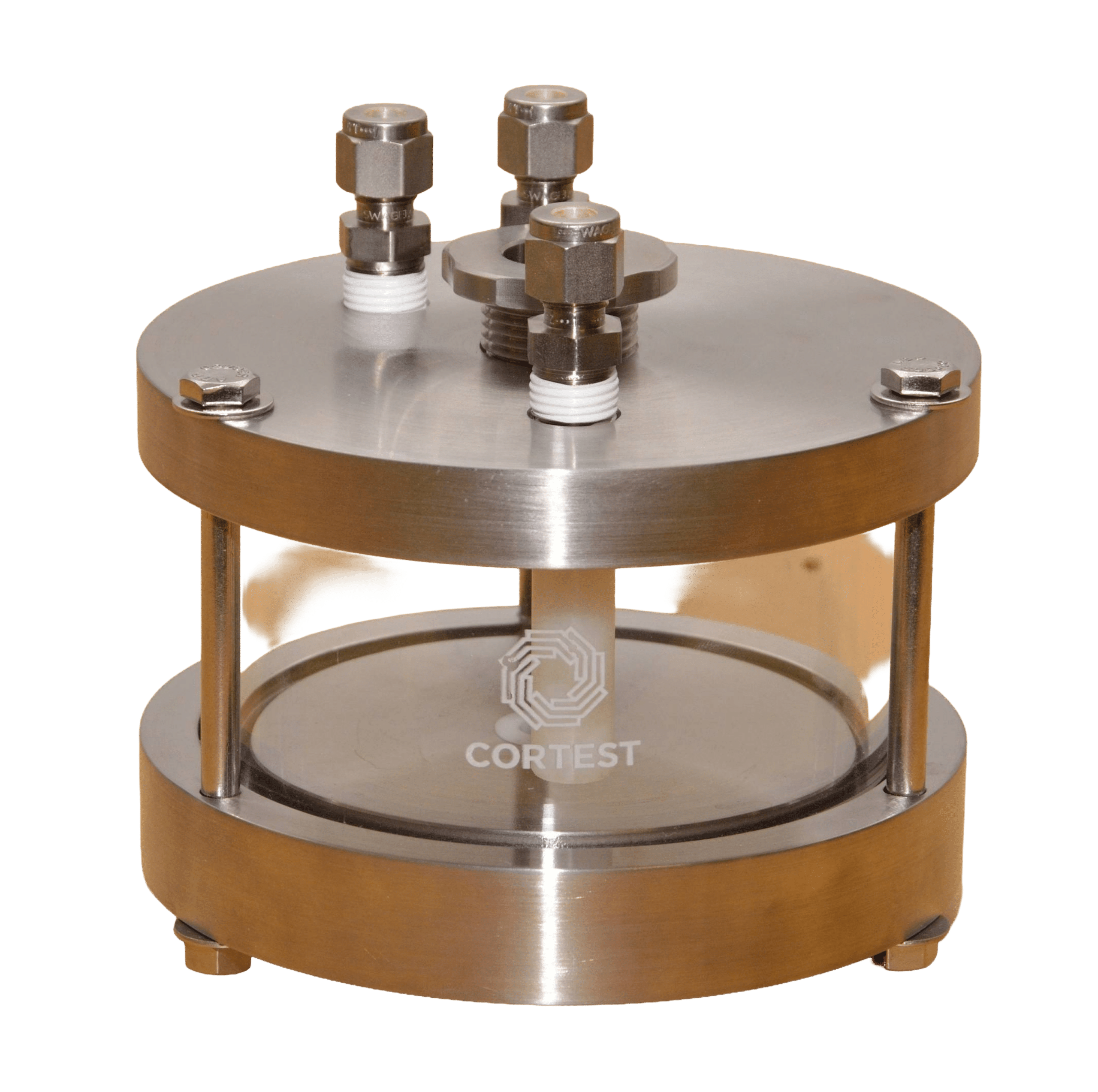 Cortest also offers Pyrex vessels as another ambient condition vessel. These vessels are custom blown from Pyrex glass. Despite the fragility of these vessels, their specimen seals are designed such that the impact of the specimen failure is not absorbed by the test cell. These vessels are made of Pyrex, making them ideal for aggressive environments that standard acrylic test cells may not be suitable for. Further, these test cells will not discolor from use during testing. These vessels can also be used in Cortest Load Frames or Deadweight Testers.