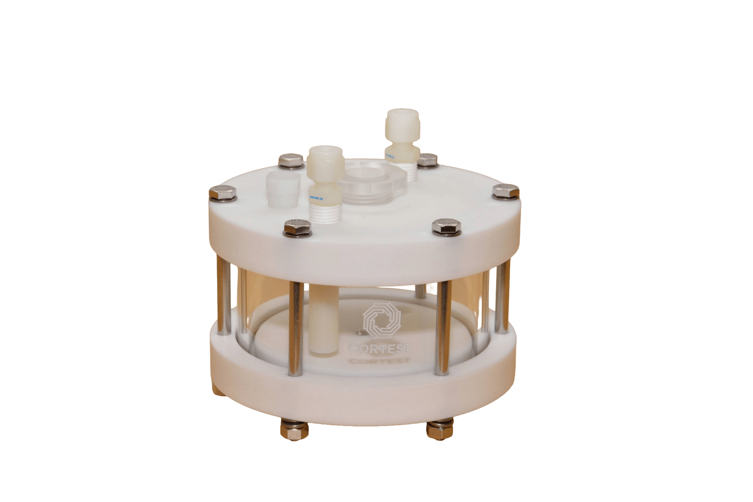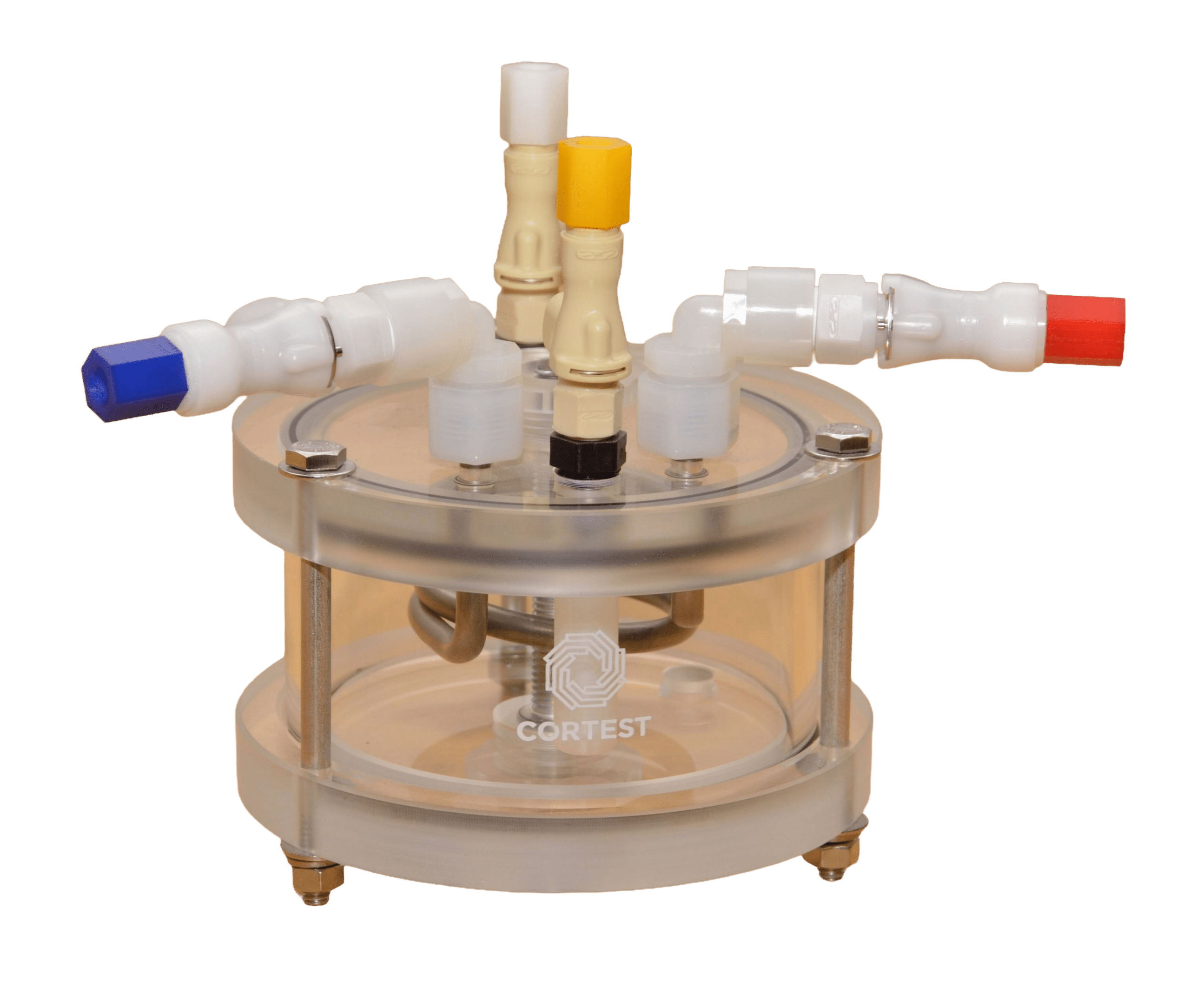 The vessel that is most commonly used with Cortest Proof Rings is the ambient condition vessel. With 330 mL capacity, these vessels use an acrylic top and bottom plate, a Pyrex glass wall, and have o-ring seals. One option for these vessels includes the installation of quick-connect fittings, these fittings allow for quick connection of gas in/out lines without the use of any tools. Another option that can be added to the acrylic vessel is the Cortest environmental control coil. When connected to an environmental controller, the C-276 coil can be used to regulate the test solution temperature. Each vessel accommodates one tensile specimen. Top and bottom plates are available to accommodate a variety of different diameter tensile specimens up to 12mm (1/2”) in diameter. These vessels can also be used in Cortest Load Frames or Deadweight Testers.