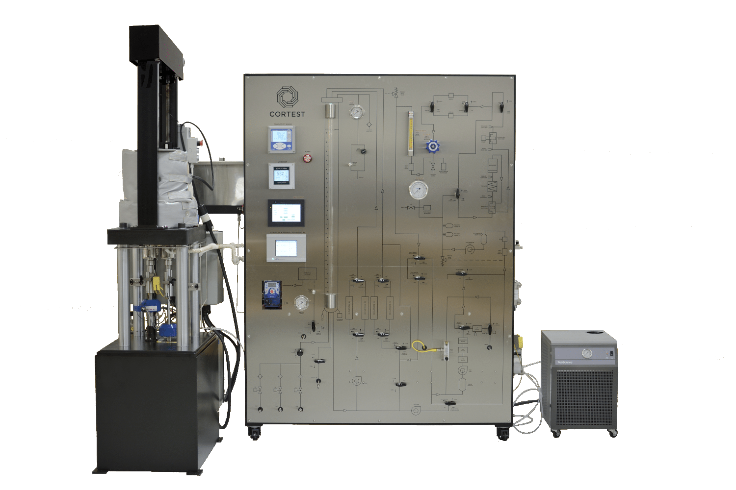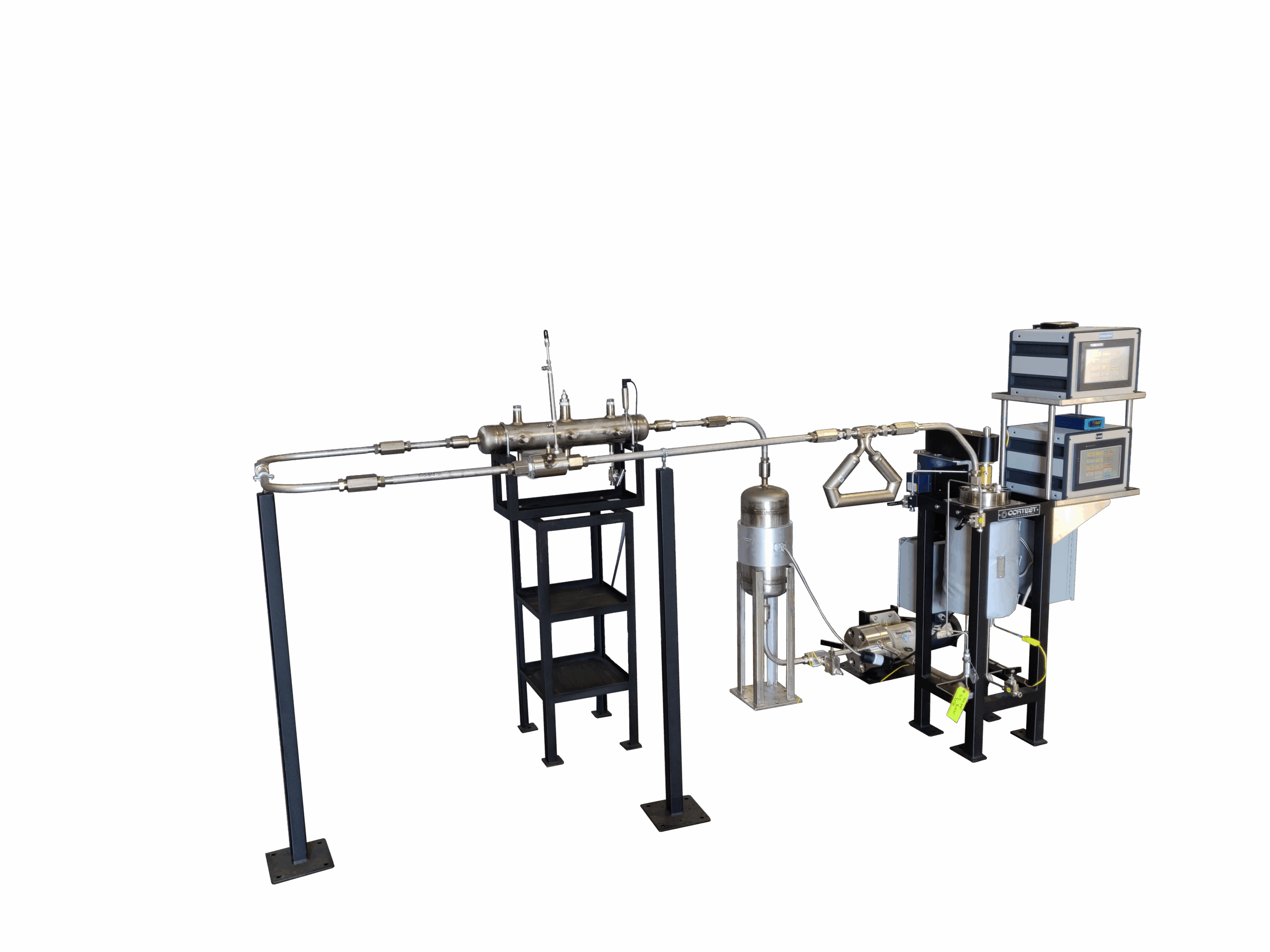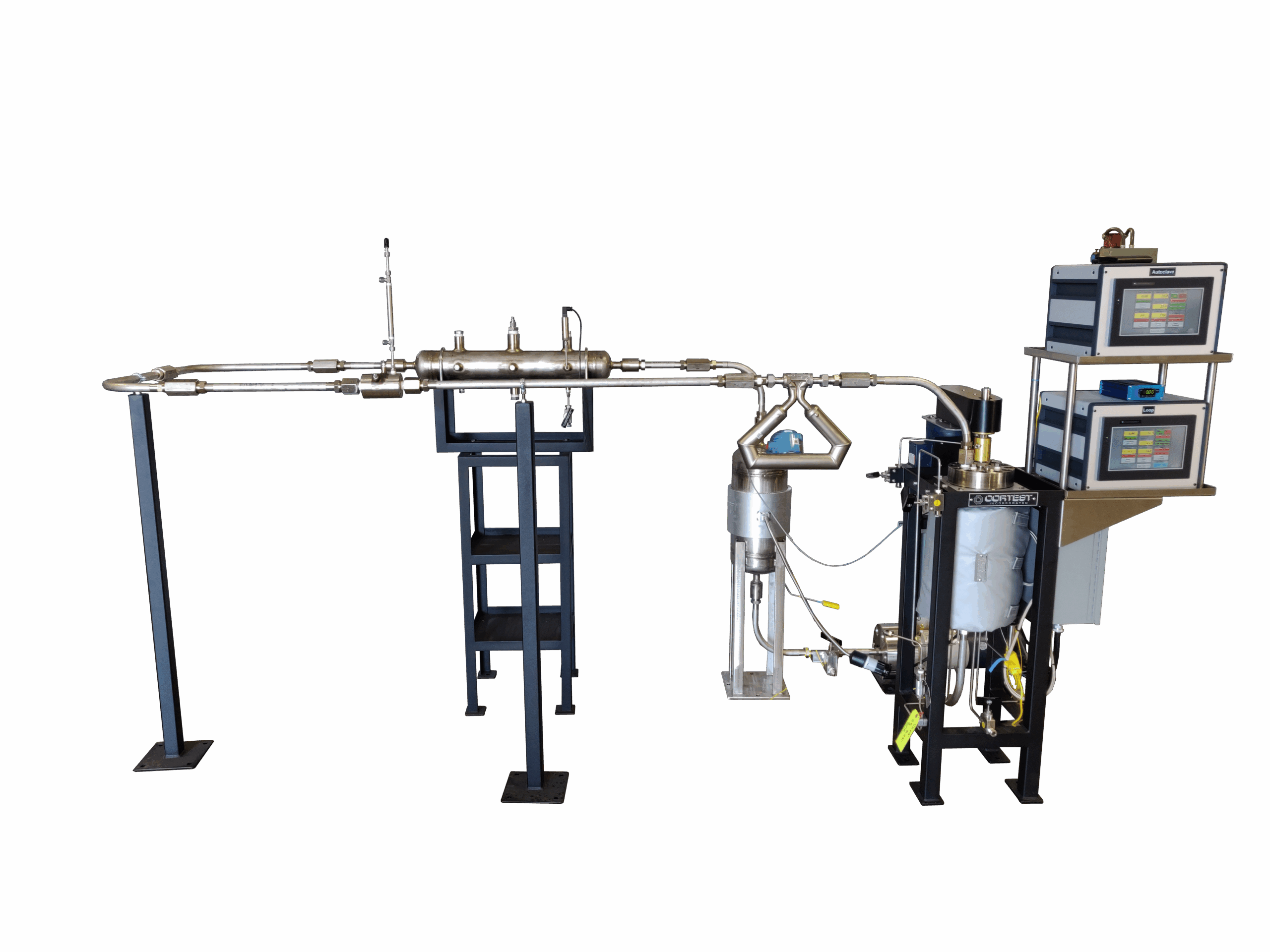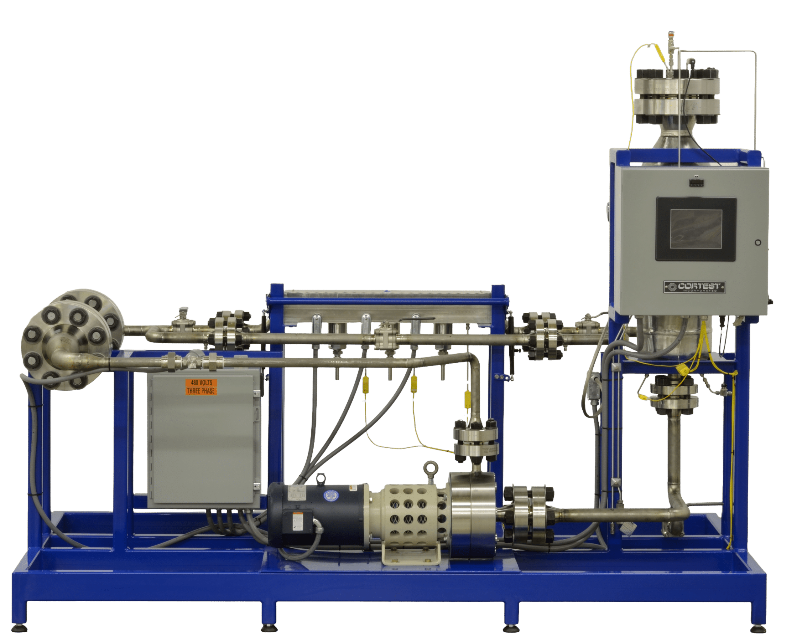 Cortest Flow Loop Systems are used to simulate flow conditions inside pipelines and other high flow environments. A wide range of applications can be simulated, such as: Single Phase Liquid Flow, Single Phase Gas Flow, Multiphase (Liquid/Gas) Flow, Laminar Flow, and Various Hydrodynamic Conditions including Corrosion Flow, Slug Flow, Annular Flow, and Stratified Flow. Flow Loops are used to measure the effectiveness of Corrosion Inhibitors and Drag Reducers in various environments and flow regimes. Analysis capabilities include Laser Doppler, Particle Image Velocimetry, Particle Shadow Sizing, Tomography, Sheer Stress measurements, and others.