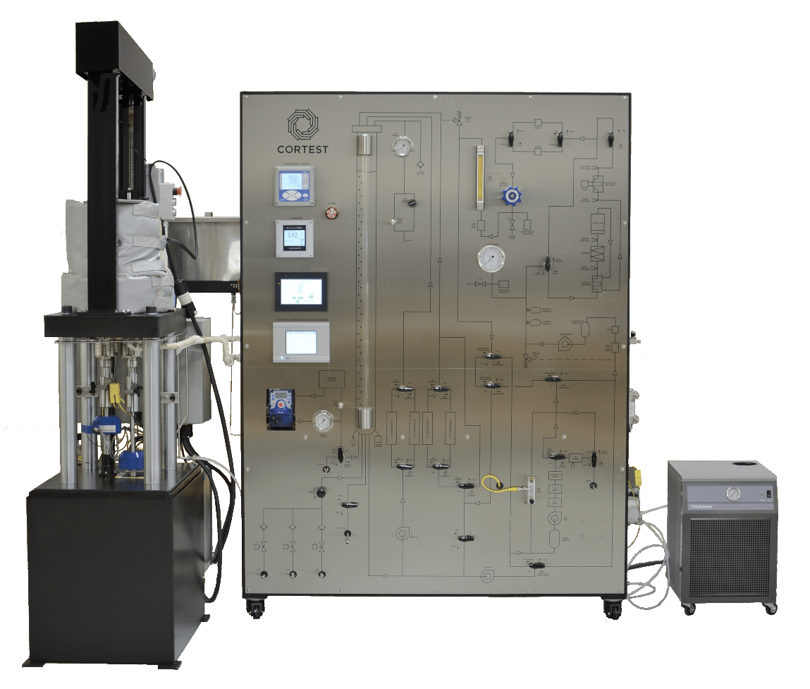 Cortest Nuclear Flow Loop Systems are used for tensile, slow strain rate, and fatigue testing in supercritical steam environments. The flow loop has two sections: the low temperature low pressure section is used to establish the desired test chemistry in terms of dissolved gases and pH. Once the desired chemistry is established, the high purity water enters the high temperature high pressure section of the loop and is heated in pre-heaters before entering the autoclave. A full system consists of the recirculating loop, autoclave, load frame and controls.